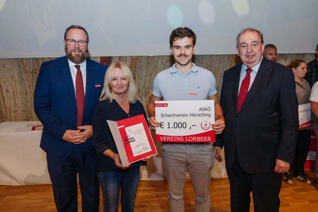 Der Askö Schachverein Hörsching wurde bereits das 3.Mal mit dieser Auszeichnung belohnt. Am 21.10.2025 fand die Verleihung im Brucknerhaus statt – Obfrau Mag. Elisabeth Saler-Grafenberger und Spitzenspieler FM Sebastian Bauer durften die mit einem finanziellen Beitrag für die Schachjugend dotierte Auszeichnung entgegennehmen.
