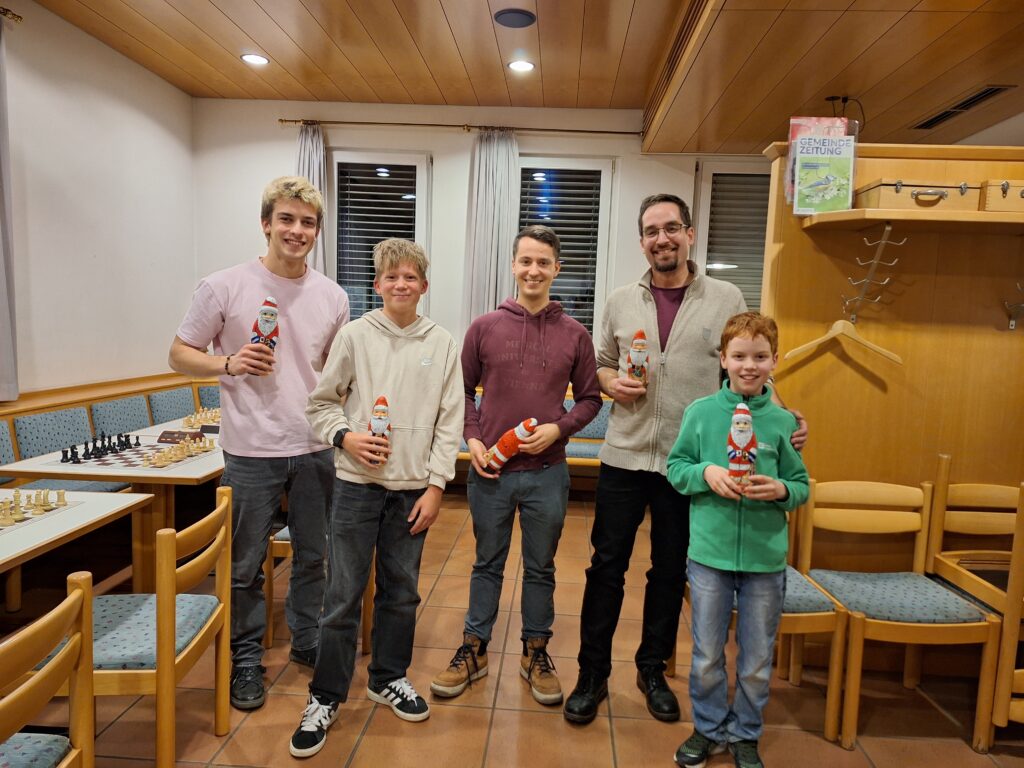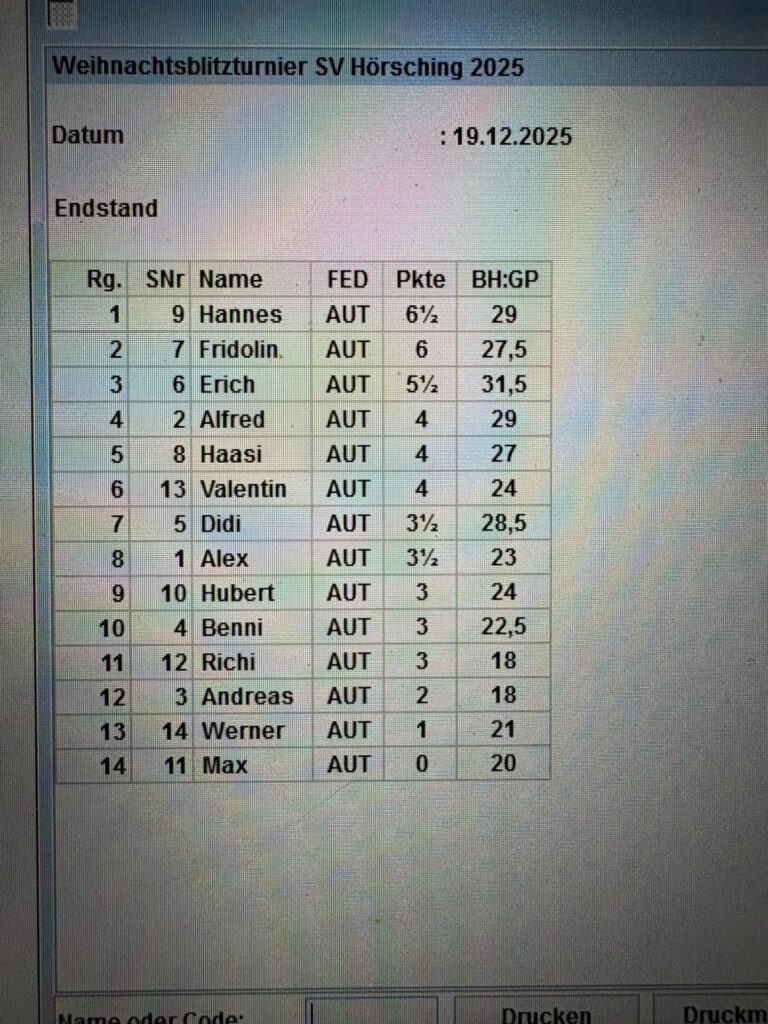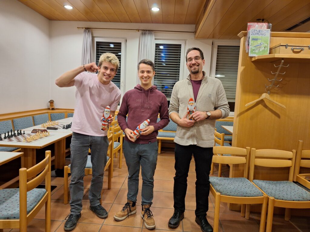 Auch heuer wurde wieder unser jährliches Weihnachtsblitzturnier durchgeführt – 14 Teilnehmer spielten in 7 Runden um den Titel Weihnachts-Blitzmeister. Der Abend war sehr lustig und spannend und erstmals nahmen auch 2 Jugendliche aus Erichs Trainingsgruppe teil, Benni und Valentin, die so manchen Erwachsenen ins Schwitzen brachten. Nach spannenden Fights kam schließlich Hannes vor Frido und Erich ins Ziel.